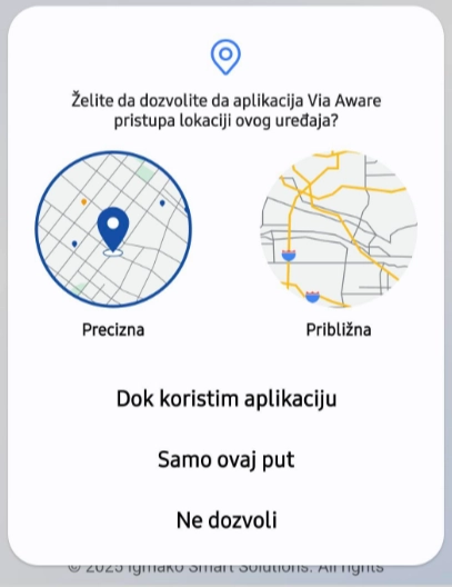 2. Pristup lokaciji uređaja. Ova dozvola omogućava aplikaciji da preuzima podatke od GPS senzora Vašeg uređaja.