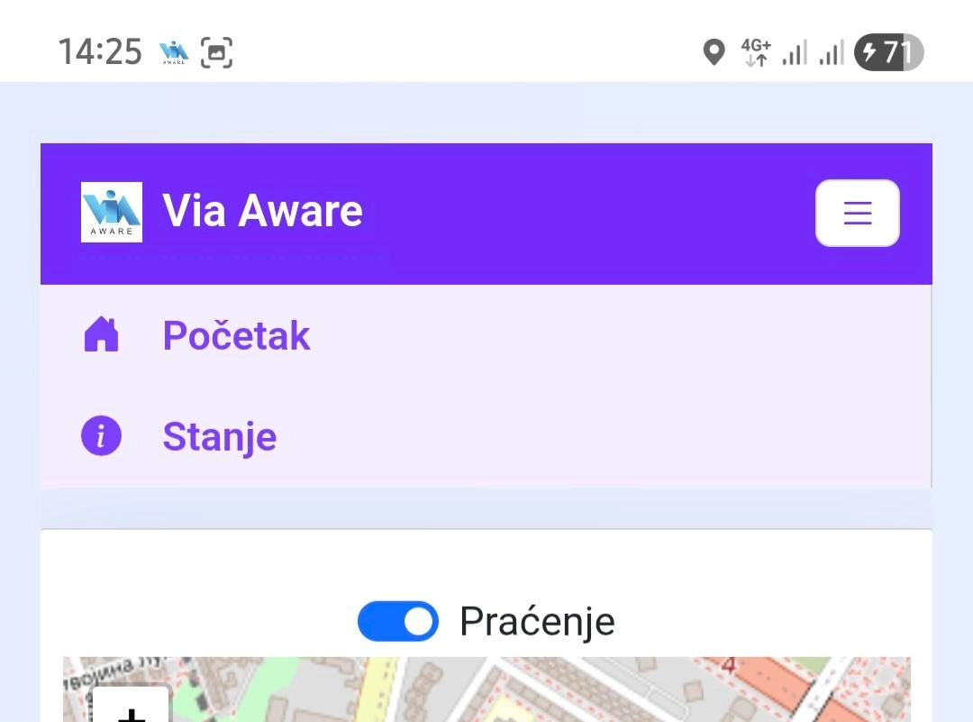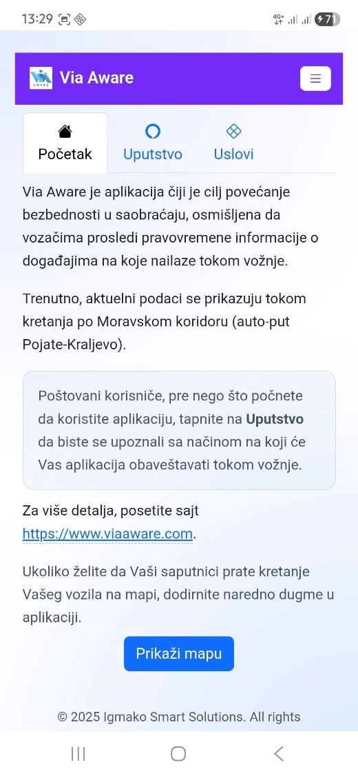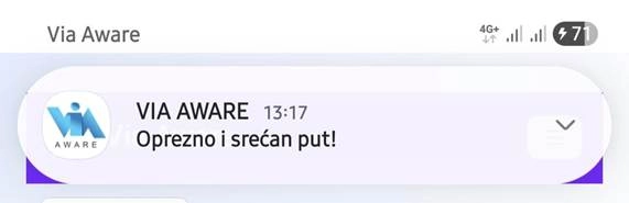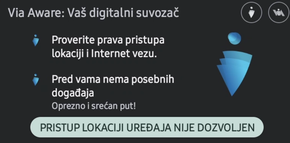 VAŽNO! Aplikacija Via Aware pomaže vozačima ukazujući na ulazak u „prostor izuzetne saobraćajne situacije“. Šta je to? U pitanju je onaj deo puta na kojem je saobraćajno opravdano obavestiti vozača o nailasku na situaciju koja zahteva poseban oprez. Ova aplikacija će Vam dati informaciju o tome na kakvu situaciju nailazi. No, imajte na umu: kakva god da je situacija, od Vas se očekuje poseban oprez i prilagođenje brzine vožnje mogućim promenama stanja saobraćaja.