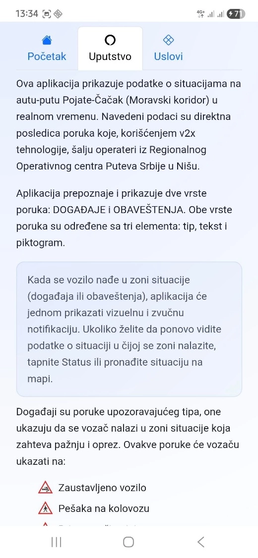Via Aware prikazuje podatke o situacijama na auto-putu Pojate–Čačak (Moravski koridor) u realnom vremenu. Navedeni podaci su direktna posledica poruka koje, korišćenjem v2x tehnologije, šalju operateri iz Regionalnog Operativnog centra Puteva Srbije u Nišu.