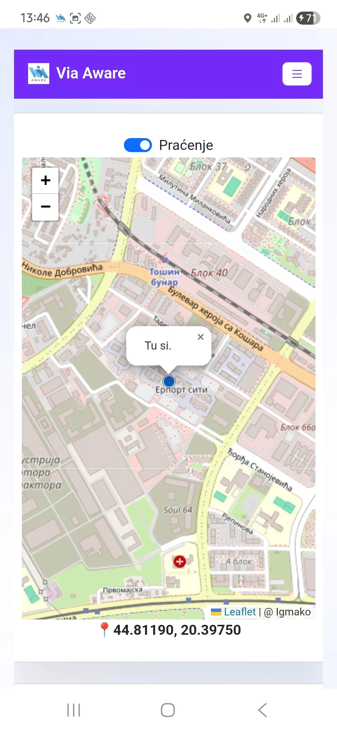 Mapu možemo (od)zumirati odgovarajućim dugmadima i standardnim gestovima („štipanje“). Dokle god je opcija „Praćenje“ uključena, mapa će se, svaki put kada se lokacija uređaja promeni, centrirati na trenutni položaj korisnika.