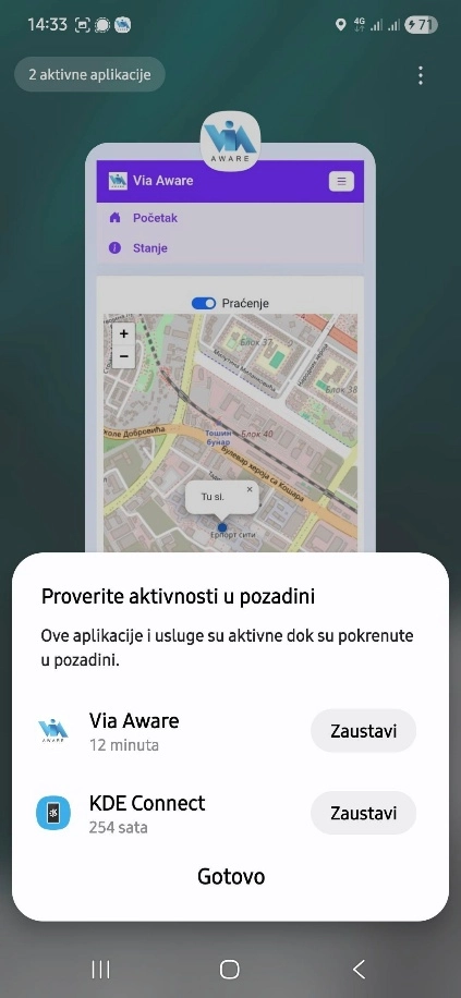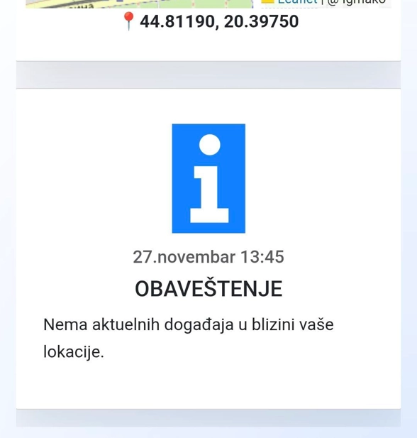 VAŽNO! Aplikacija u prikazu mape radi kao pozadinski servis. Ovo znači da će se obaveštenja pojavljivati i ako aplikaciju sklonite sa ekrana uređaja.
