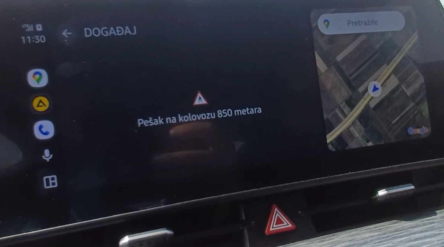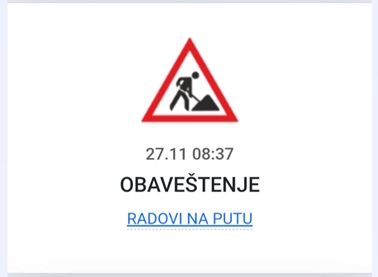 VAŽNO! Kada uređaj uđe u prostor saobraćajne situacije, uz zvučno obaveštenje (standardni zvuk notifikacije za taj uređaj), pojaviće se obaveštenje sa osnovnim informacijama (tip i opis saobraćajne situacije). Takođe, na mapi će biti prikazan piktogram, opis i putanja saobraćajne situacije. Zvučno i vizuelno obaveštenje se više neće pojavljivati, a prikazani saobraćajna situacija će ostati na mapi.
