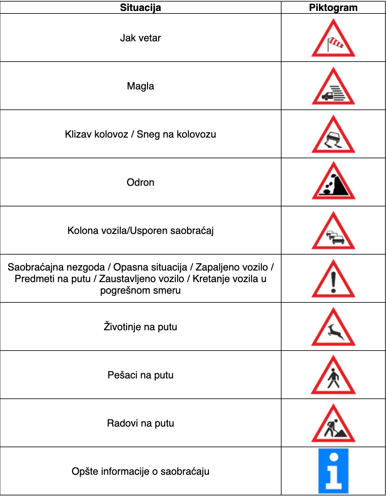Događaji su vizuelno opremljeni piktogramima koji su usklađeni sa saobraćajnim znacima koji su poznati vozačima.